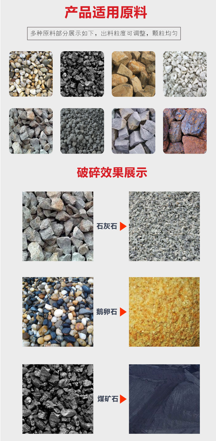 鹅卵石、河卵石、花岗岩、玄武岩、辉绿岩、金矿、银矿、铅锌矿、铜矿、钼矿、铁矿、锰矿、钨矿、磷矿、重晶石、铝土矿、石灰石、石英石、石膏、碳酸钙、煤、石墨、长石、钾长石、萤石、水泥、陶瓷以及其他骨料和建筑垃圾等材料。